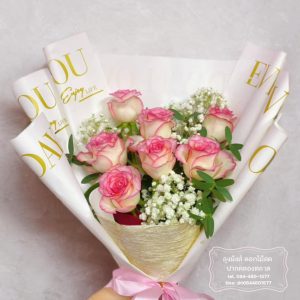 ช่อดอกกุหลาบชมพู 7 ดอก กระดาษสีขาวมีตาข่าย