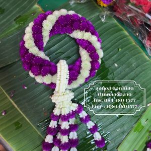พวงมาลัยบานไม่รู้โรยสีม่วงสลับขาว ชายดอกบานไม่รู้โรยสลับดอกรัก