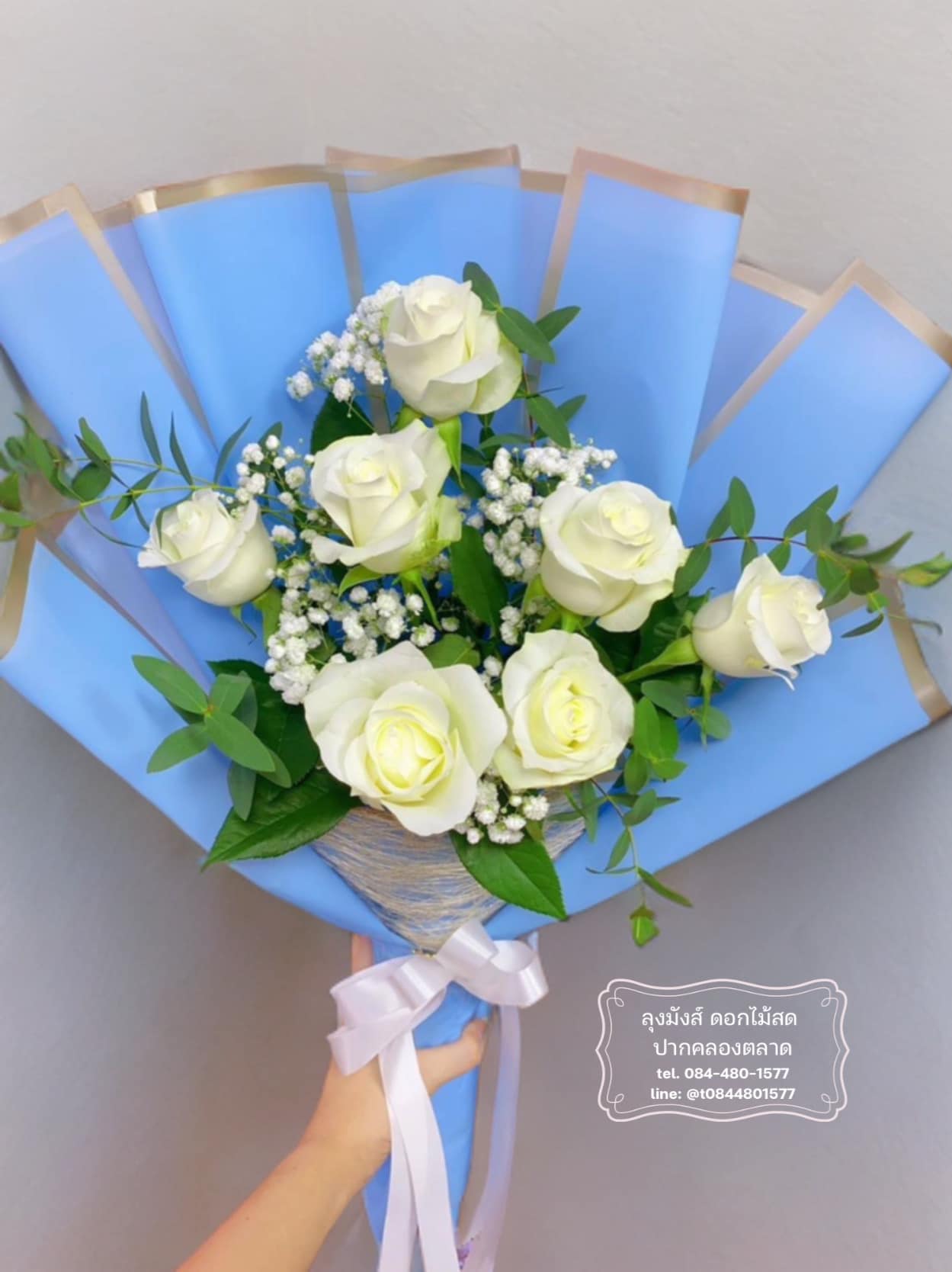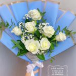 ช่อดอกกุหลาบขาว 7 ดอก กระดาษสีฟ้ามีตาข่าย